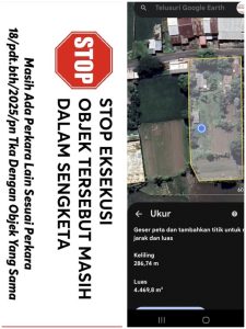 Elhan law firm Ramadan.,SH beserta Mirwan SH, selaku Tim Kuasa Hukum.termohon tergugat eksekusi, ditolak secara mentah, mentah, oleh Ketua Panitra dan Mahkama Agung,, terkait luas lahan yang diklaim oleh pemohon tergugat dengan luas area Sesuai putusan 0,35Ha(3.500 meter), secara fakta yang di eksekusi 0,44(4.400 meter) artinya ada kelebihan objek bagian utara