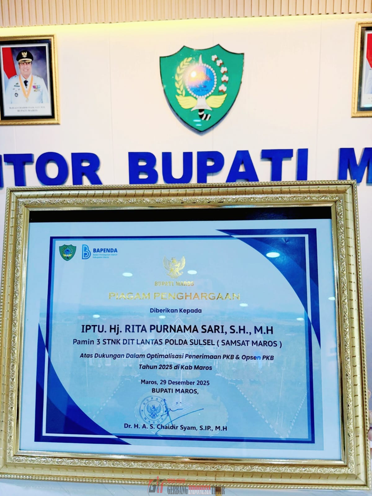 GERBANG INDONESIA TIMUR NEWS.COM MAROS —— Realisasi Pajak Kendaraan Bermotor (PKB) di Sulawesi Selatan tahun 2025 mencapai kurang lebih 1, 2 T dan untuk Capaian Opsen PKB yang diterima oleh pemerintah Kab. Maros adalah sekitar 22,6 Milyar atau 92% dan Capaian Opsen BBNKB mencapai sekitar 22,8 Milyar.atau 96,6%. Atas dasar capai tersebut, Bupati Maros memberikan apresiasi kepada SAMSAT Maros dalam upaya/kinerja dalam membantu penerimaan PAD Kab. Maros dari sector Opsen PKB dan Opsen BBNKB.