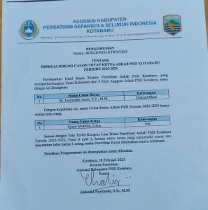 Pada 18 Februari 2025 kemarin, Komite Pemilihan Askab PSSI Kotabaru mengumumkan Pencalonan atas nama M. Fachrudin Amin, sebagai calon Ketua terpilih Askab PSSI Kotabaru di-Diskualifikasi.