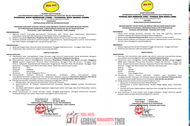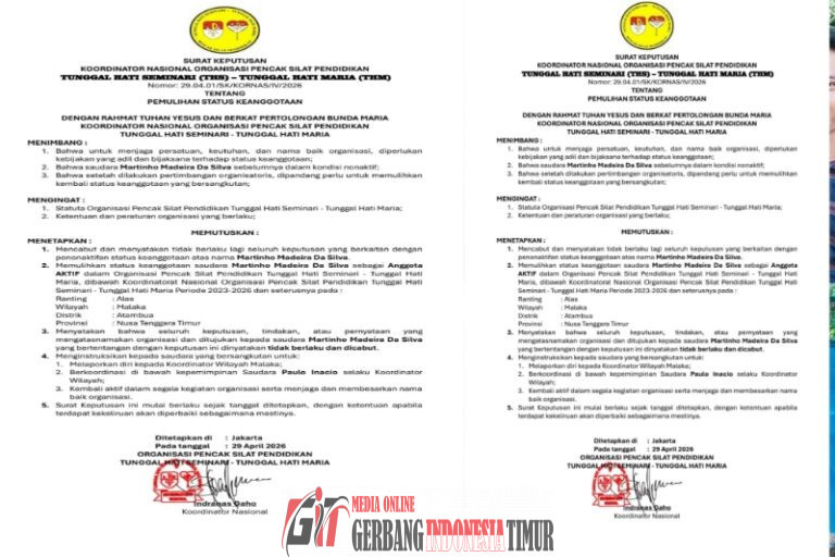GERBANG INDONESIA TIMUR NEWS.COM JAKARTA,—— Sebuah kabar menyejukkan menyelimuti keluarga besar Organisasi Pencak Silat Pendidikan Tunggal Hati Seminari – Tunggal Hati Maria (THS-THM). Melalui Surat Keputusan Nomor: 29.04.01/SK/KORNAS/IV/2026, Koordinator Nasional secara resmi mengumumkan pemulihan status keanggotaan saudara Martinho Madeira Da Silva.