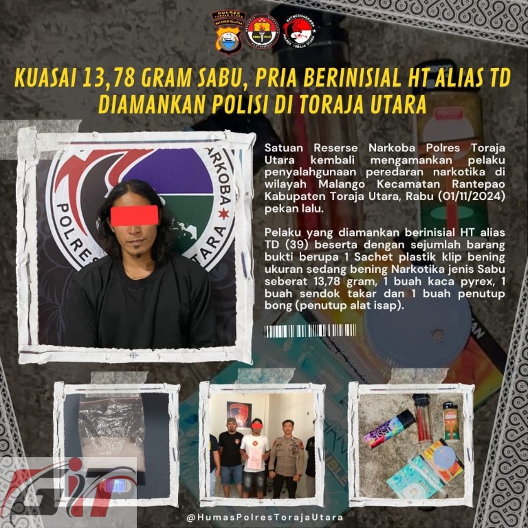 Saat ini, Pelaku HT alias TD dengan sejumlah barang bukti yang ditemukan telah berada di Mapolres Toraja Utara dan sedang menjalani proses hukum.
