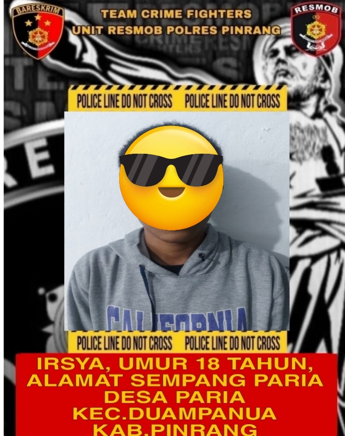 Pada hari minggu tgl 20 April 2025 sekitar pukul 01.00 wita di Sempang Paria Desa Paria Kec. Duampanua Kab.Pinrang Tim Crime Fighters Unit Resmob Sat Reskrim Polres Pinrang di pimpin oleh Kanit Resmob IPDA AHMAD  HARIS M. S. Pd.I  telah mengamankan terduga pelaku tindak pidana menyetubuhi anak di bawah umur.
