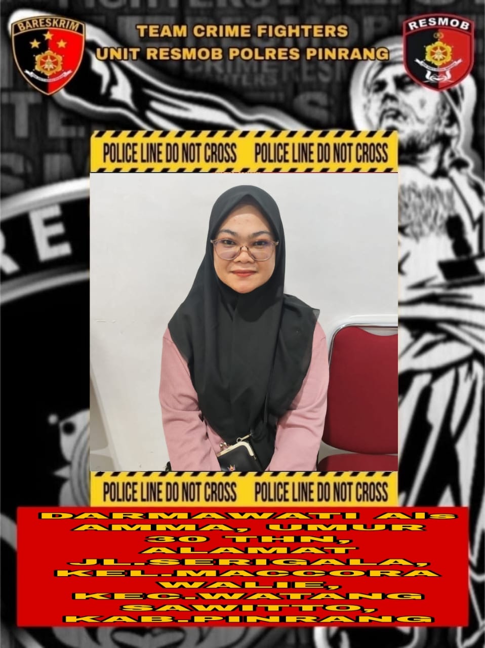 Perempuan DARMAWATI alias AMMA, umur 31 tahun, pekerjaan Mengurus rumah tangga, alamat Jl. Serigala Kelurahan. Maccorawalie Kecamatan Watang Sawitto Kabupaten Pinrang.