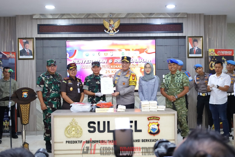 GERBANG INDONESIA TIMUR NEWS.COM MAKASSAR — Kepolisian Daerah Sulawesi Selatan (Polda Sulsel) melaksanakan pemusnahan barang bukti narkotika jenis kokain dengan berat bruto 25 kilogram di Mapolda Sulsel, Senin (16/03/2026). Kegiatan ini merupakan tindak lanjut dari penyerahan barang temuan oleh Kodam XIV/Hasanuddin kepada Polda Sulsel untuk proses hukum lebih lanjut.