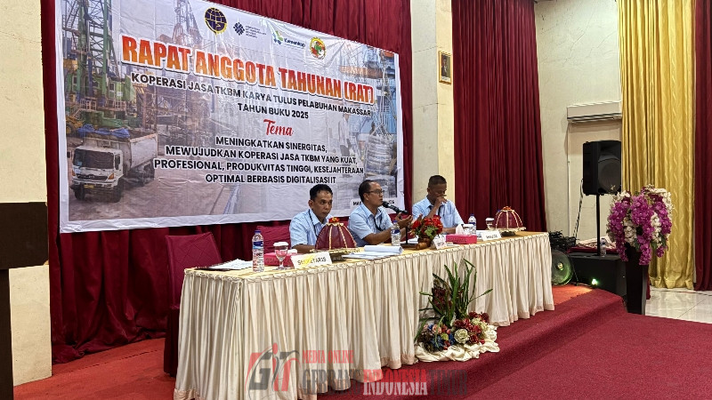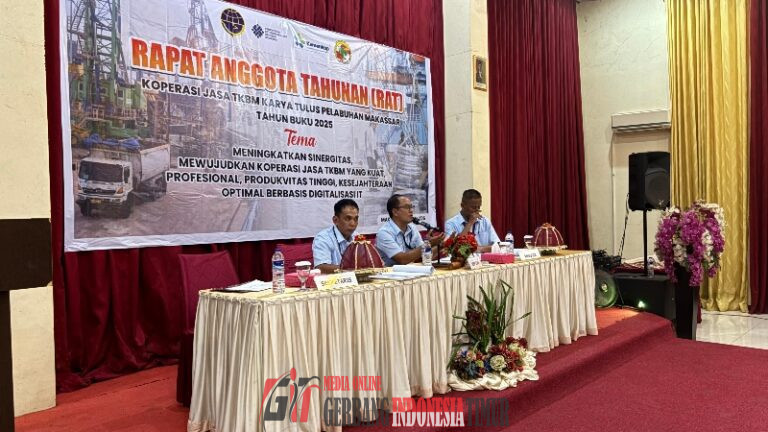 GERBANG INDONESIA TIMUR NEWS.COM – MAKASSAR ——-  Koperasi Jasa Tenaga Kerja Bongkar Muat (TKBM) Pelabuhan Makassar Sulawesi Selatan menggelar rapat anggota Tahunan (RAT) tahun Buku 2025 di Hotel Marina, Jalan Andalas, kota Makassar, Rabu (15/04/2026).)