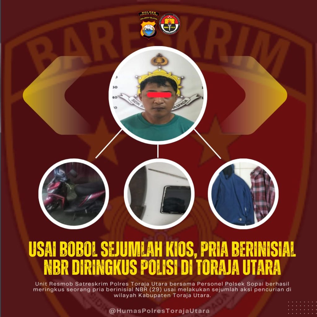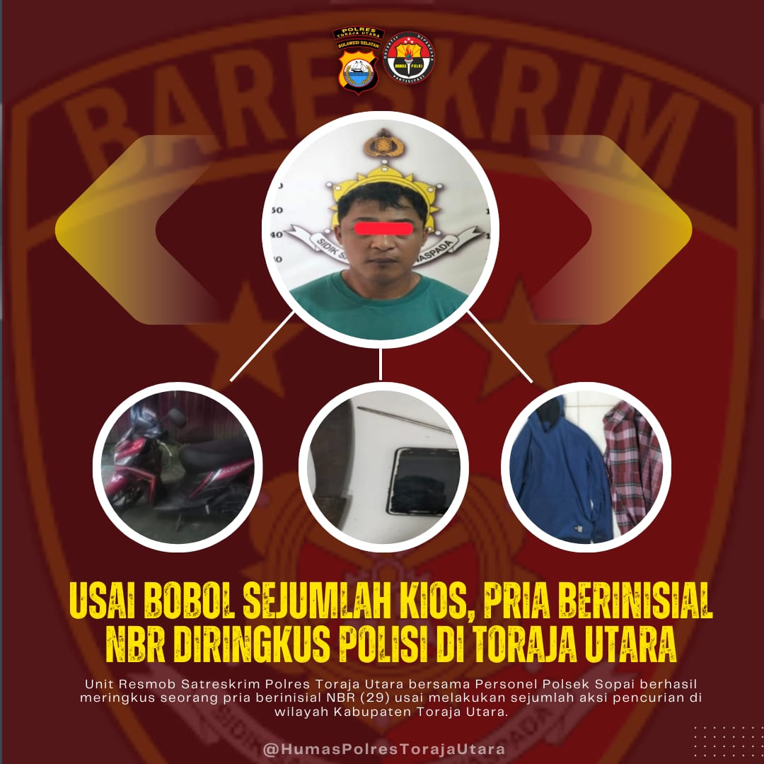 TORAJA UTARA SULAWESI SELATAN GERBANG INDONESIA TIMUR NEWS.COM ——— Unit Resmob Satreskrim Polres Toraja Utara bersama Personel Polsek Sopai berhasil meringkus seorang pria berinisial NBR (29) usai melakukan sejumlah aksi pencurian di wilayah Kabupaten Toraja Utara.